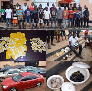 It was also gathered that over 300 SIM cards, 18 Apple laptops, 50 mobile phones (21 Iphones) and two bags of charms were allegedly recovered at the point of arrest.