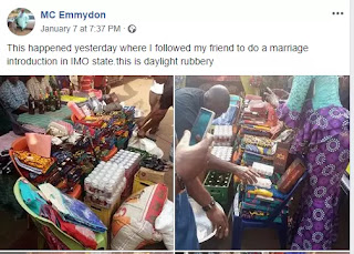 According to MC Emmydon, an eyewitness who was shocked by what he saw, his friend (the groom) bought various sets of wrapper, bags of rice, drinks both alcoholic and non-alcoholic among others things which he gave his partner’s family for their wedding introduction on Sunday, January 6th.