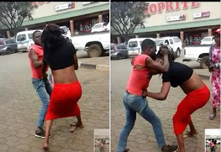 The lady then, attacked the man right there in front of the supermarket as two of them fought brutally to the shock of onlookers.They were later separated by passersby as the raging lady was restrained.A Facebook user identified as James Noel, shared the footage but didn’t give the location where it happened.Internet users have berated the pair for the shameful act.