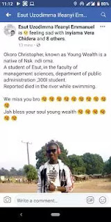 Okoro Christopher, known as Young Wealth is a native of Nsk ndi oma. A student of Esut, in the faculty of management sciences, department of public administration ,300l student. Reported died in the river while swimming.
