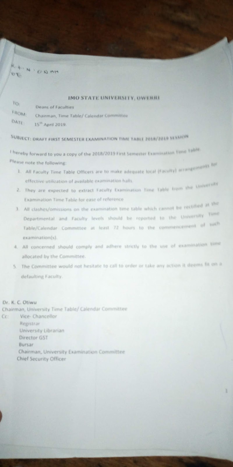 *The Imo State University, Owerri (IMSU) management has released the first batch of the 2018/2019 first semester examination time table today.*