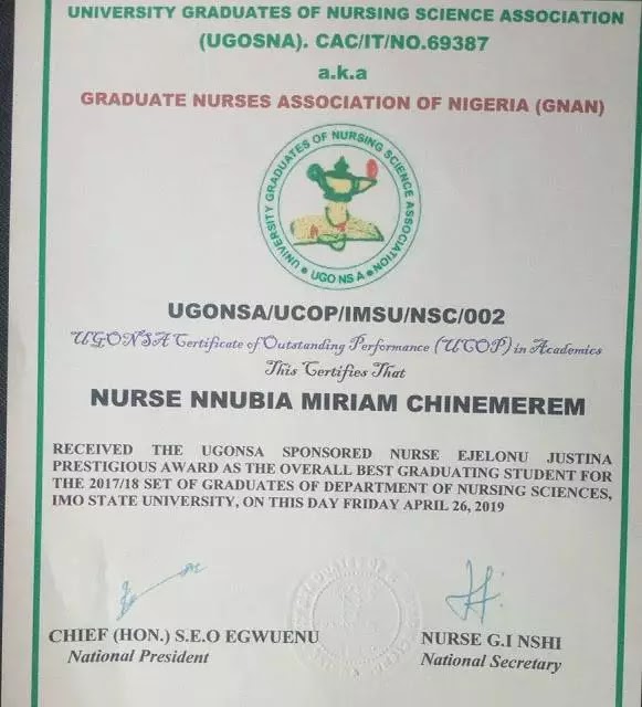 She came out overall Best in Medical Surgical Nursing, Community Health Nursing, and Midwifery, and was had First Class in Nursing Science.