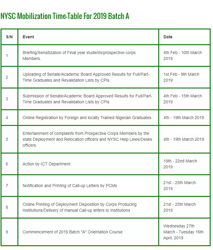 This is to inform you that the long-awaited NYSC official timetable s finally out and the waiting is over. The NYSC 2019 Batch B mobilization has officially started.