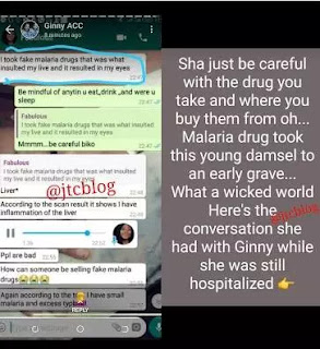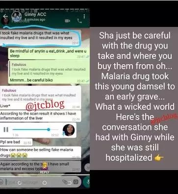 In her last conversation on WhatsApp, she narrated how she took a fake malaria drugs prescribed to her at the pharmacy. Below is the chat that proves the claim that fake malaria drug was the cause of the ESUT student’s death.