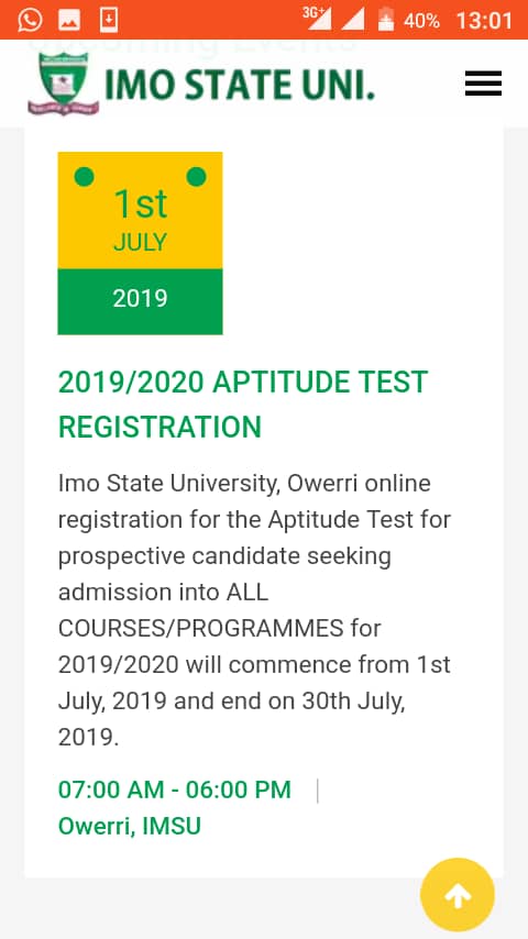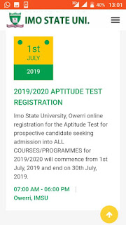 Imo State University, Owerri online registration for the Aptitude Test for prospective candidate seeking admission into ALL COURSES/PROGRAMMES for 2019/2020 will commence from 1st July, 2019 and end on 30th July, 2019..