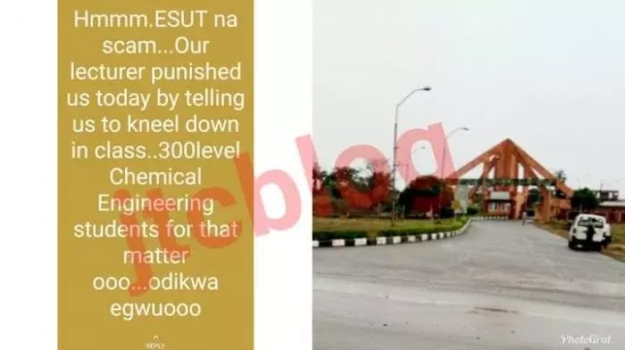A 300l student of Enugu State University of Science and Technology, ESUT has taken to his WhatsApp status to express how surprised he was after a lecturer asked the whole class to kneel down for making noise while the lecturer was making a phone call in the class.