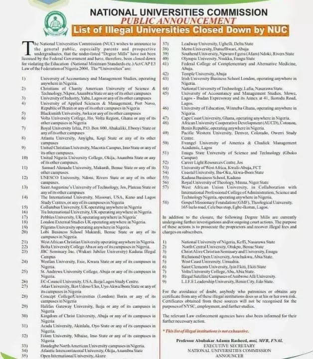 A Monday bulletin from the office of the Executive Secretary on NUC, dated July 29, listed all the illegal universities across the country.