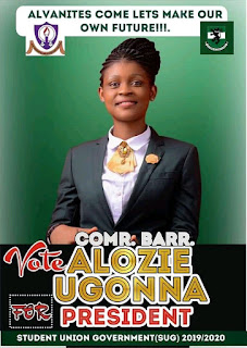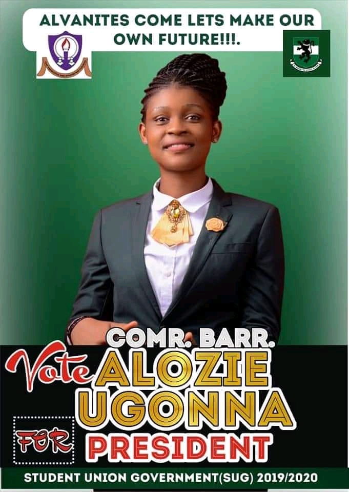 Alozie Ugonna Gloria, today (the 22nd day of August 2019) emerged winner of the just concluded Students Union Government (SUG) Election of Alvan Ikoku Federal College of Education, Owerri (AIFCE).