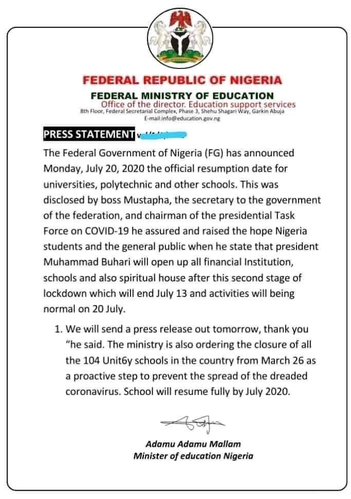 Some news outlets had reported that the federal government had fixed July 20 as the date for the official resumption of schools across the country.