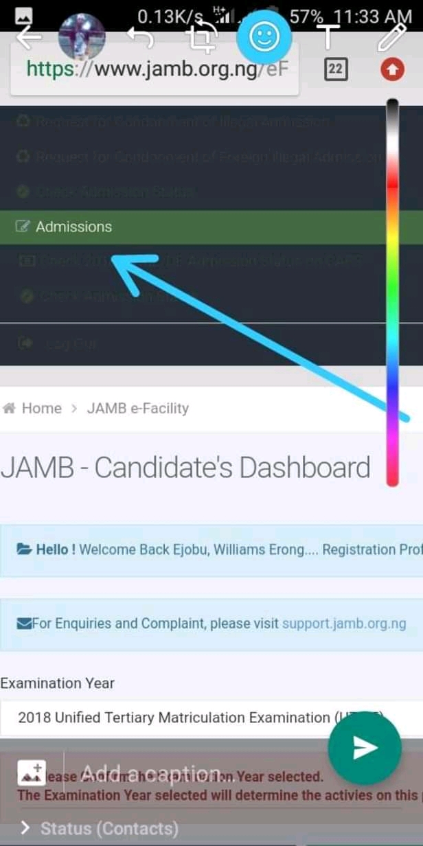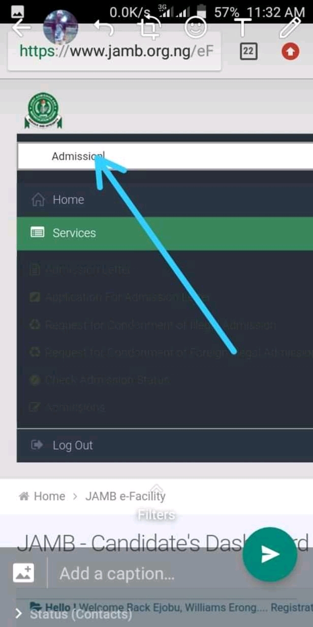 Once you are on your dashboard. Scroll to the end of the page to locate “Check Admission Status“
