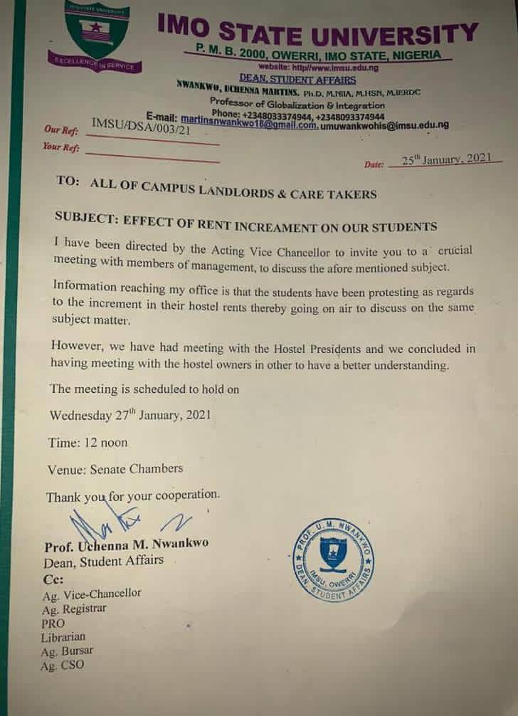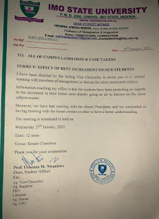 There will be a important meeting as regards to the issue of hostel rent increment of all IMSU ( ALLIANCES) off campus Hostel landlord and care takers with the members of university management, as directed to the Dean of students affairs by the acting vice Chancellor imo state University.